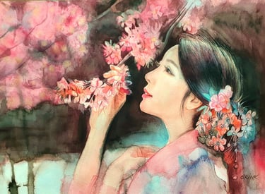 Genom att arbeta med akvarellens transparens och bygga upp verken i flera tunna lager skapar hon ett särskilt djup och ljus.