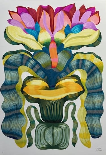 Genom att använda mättade färger och rika texturer skapar hon verk som sprudlar av livslust och skildrar mötet mellan det reella och det fiktiva.